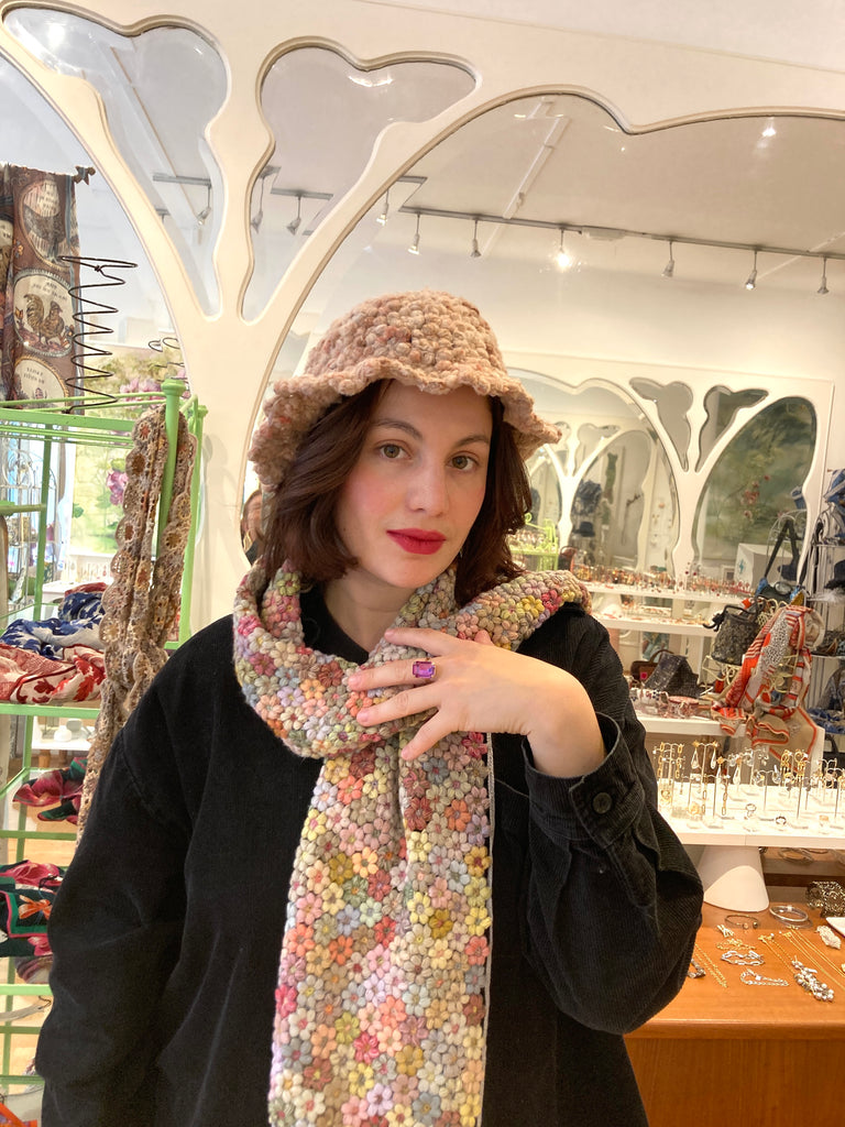 Chapeau cloche en laine, crocheté à la main, avec un motif fleur, peut s'ajuster comme un bonnet